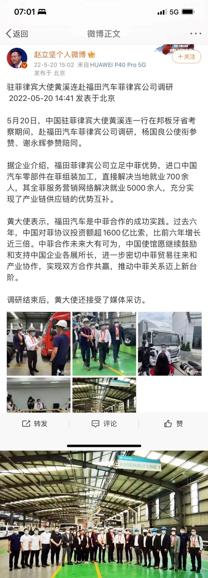 Zhao Lijian, Foreign Ministry Spokesperson, posted an article on his personal real name microblog to "endorse" BAIC Group's booming international business. On the same day, Huang Xilian, ambassador to the Philippines, visited Foton Automobile Philippines for research, which has ranked first in sales in the Philippine six-wheel truck market for two consecutive years through the efforts of commercial vehicle technology upgrade and market development in 15 years.